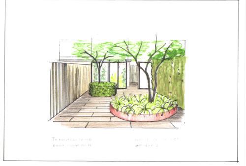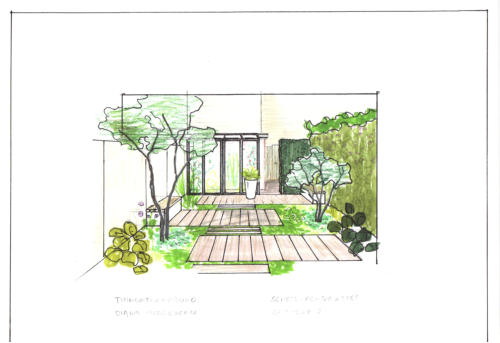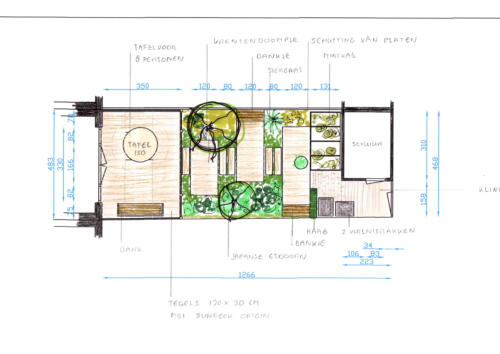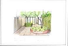 voor een tuin van ongeveer 12,5 x 5 mtr. Aan huis komt een serre en achterin komt